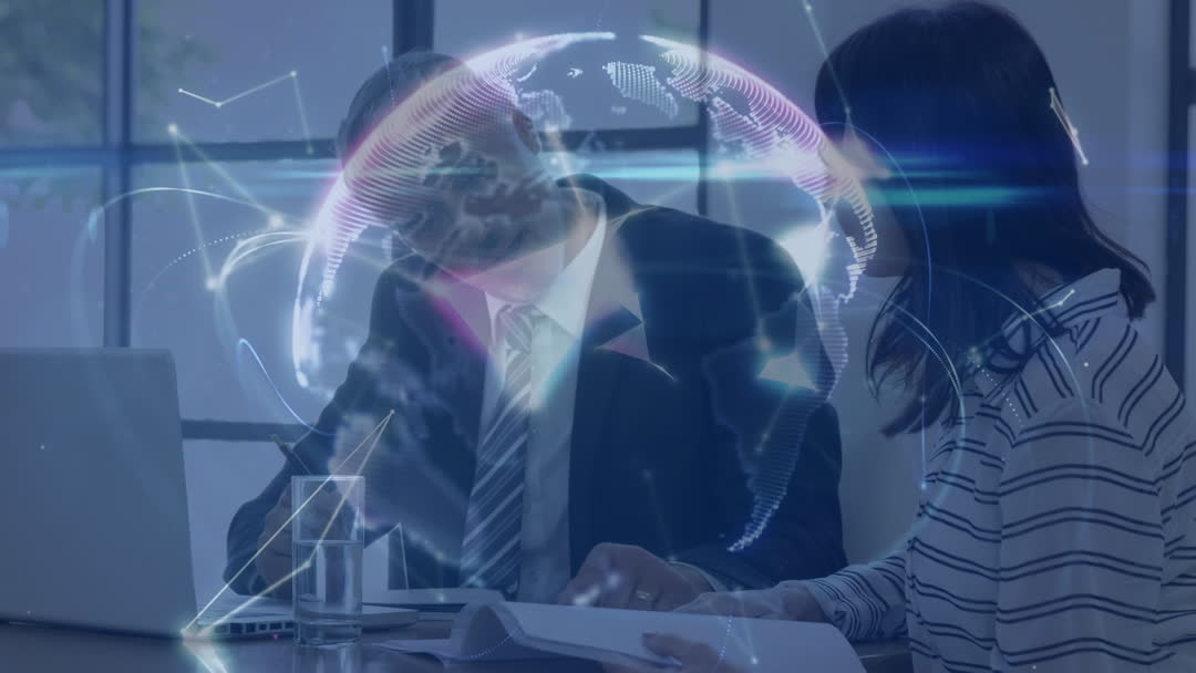 Business professionals discussing with a futuristic globe and network connections overlaid, suggesting global reach and technological advancement. Suitable for themes involving innovation, digital transformation, global business dealings, and collaborative work environments.