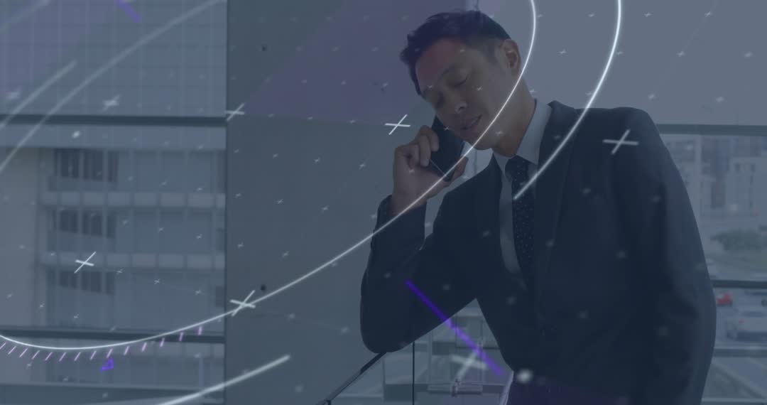 Young executive in a modern office engaging in a phone conversation with a digital data interface overlaid. Perfect for illustrating corporate communication, digital innovation in the workplace, or the integration of technology in business settings.