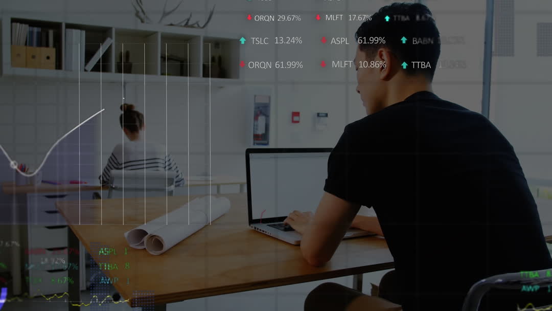 Business Executive Using Laptop with Digital Interface Overlay Video