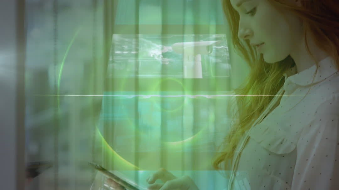 A businesswoman engages with her digital tablet amidst a room filled with technology, symbolizing interconnectedness and real-time data management. Ideal for business, technology, and futuristic themes. Useful in campaigns highlighting modern business practices, network innovations, tech-focused promotions, or environmental digital leadership.