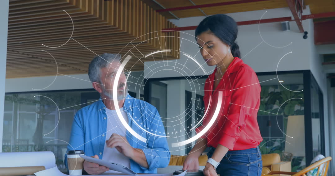 Executives engaged in a collaborative discussion, with a digital interface overlay suggesting technology or innovation. This could be used in presentations, articles on digital transformation, innovation strategies, or technology integration in business. Perfect for conveying concepts of teamwork, modern office dynamics, and forward-thinking leadership.