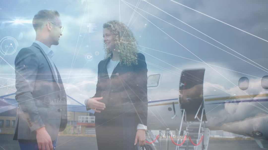 Business executives are engaged in a discussion at an airport, with a private jet in the background. A digital interface overlay with network connections symbolizes global business and technology concepts. This can be used for marketing materials related to corporate travel, innovation in business, technology solutions, and global networking events.