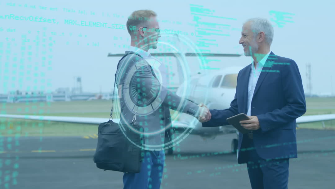 Two business executives are shaking hands on an airport runway, symbolizing successful collaboration and partnership. The video overlays digital graphs and data, emphasizing modern, tech-driven business strategies. Perfect for use in business, technology, and travel contexts, this visual illustrates the connection between traditional networking and innovative solutions.