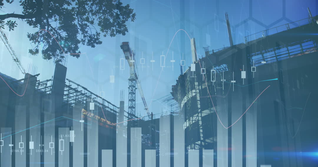 Overlay of financial graphs on a construction site emphasizing business growth and investment potential. Suitable for financial reports, business development proposals, or investment strategy presentations, illustrating the link between construction and economic trends.