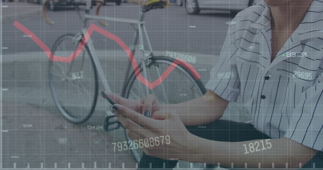 Overlay of a growth chart with a person using a cellphone, possibly for business or financial data. Depicts contemporary technology interaction with urban life. Useful for themes of global business trends, mobile technology, or innovation.