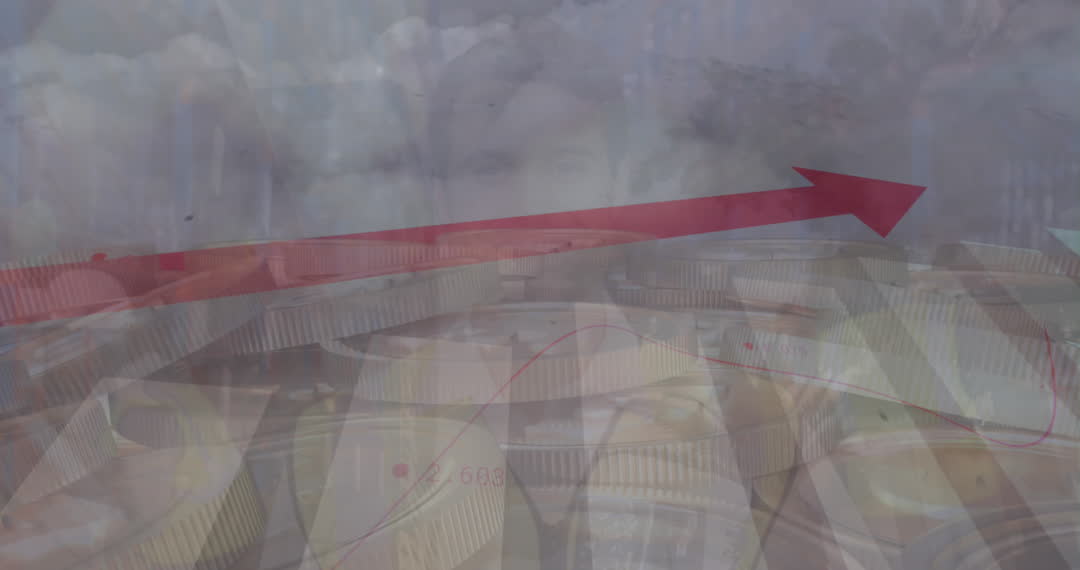 Illustrates economic and business growth with overlay of a digital interface and visuals suggesting upward trend and coin videory, suitable for conceptual presentations focusing on financial data analysis, global market projection, and business strategy analysis.