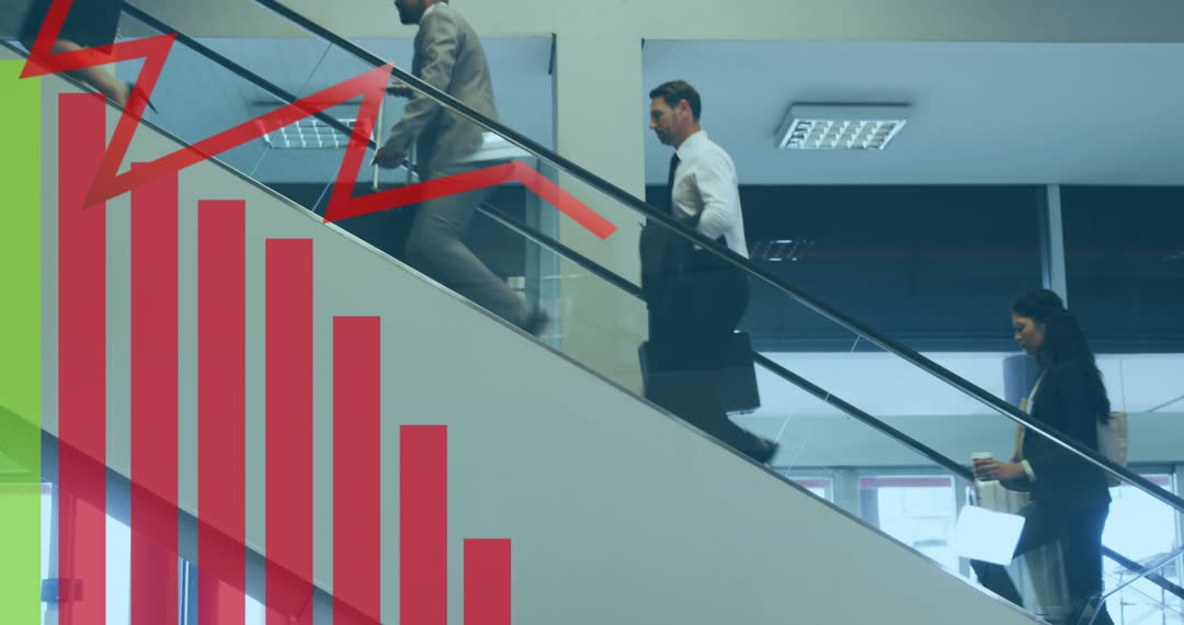 Visual representation of business growth concept, with diverse professionals climbing stairs in an office combined with dynamic data charts. Symbolizing teamwork and corporate success, this video can be used in business presentations, marketing materials, and motivational content aimed at illustrating progress and achievement within an organization.