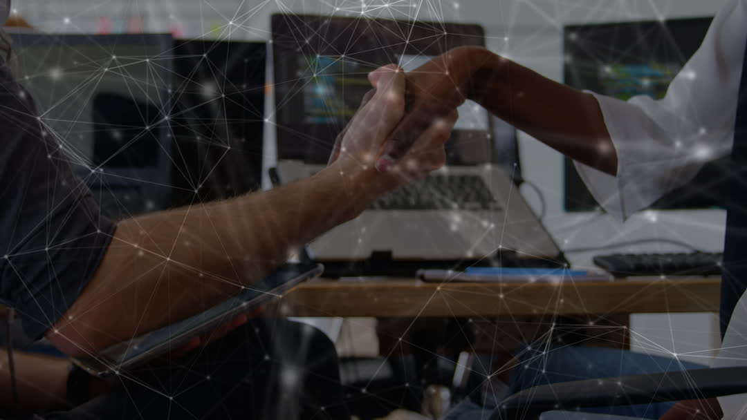 Scene depicts diverse professionals engaging in a handshake, symbolizing successful partnerships and collaboration in a digital world. Concept of global connections enhanced by animated globe and network overlay. Useful for illustrating business success, teamwork, and modern networking technologies.