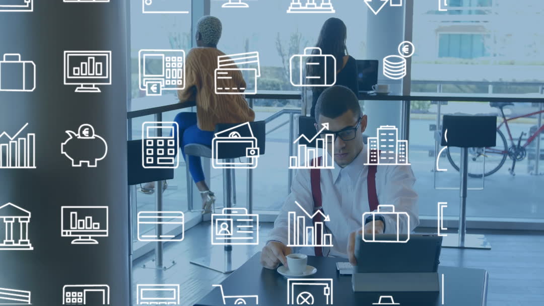Business Icons Overlay Diverse Professionals Using Technology Video