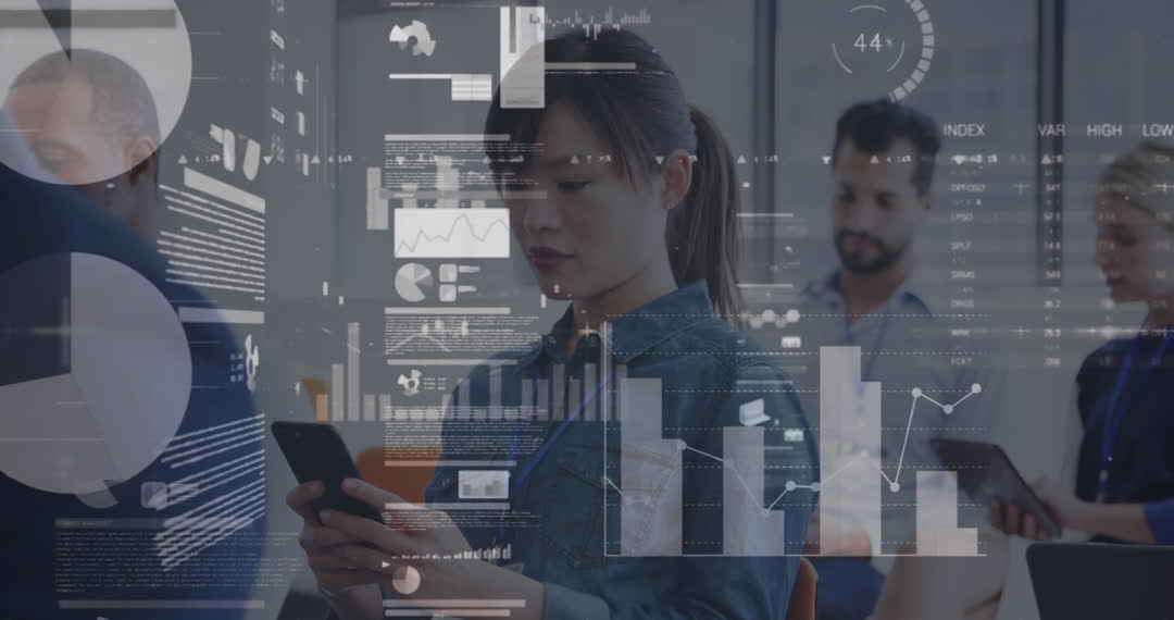A businesswoman focusing on her smartphone, representing the integration of technology in modern workspaces. Multiple digital graphs and charts appear over her, symbolizing data analysis and market trends. Ideal for illustrating business, finance, technologically advanced industries, and teamwork. Suitable for articles on digital transformation and business growth.