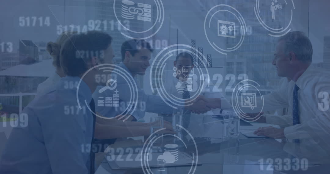 A diverse group of business professionals engaged in a meeting symbolize collaboration and global networking. Digital icons overlaying the meeting represent technological integration and innovation. The handshake emphasizes successful partnership and connections in the modern digital landscape. This video is ideal for presentations on corporate strategies, fintech, digital transformation strategies, and global business solutions.