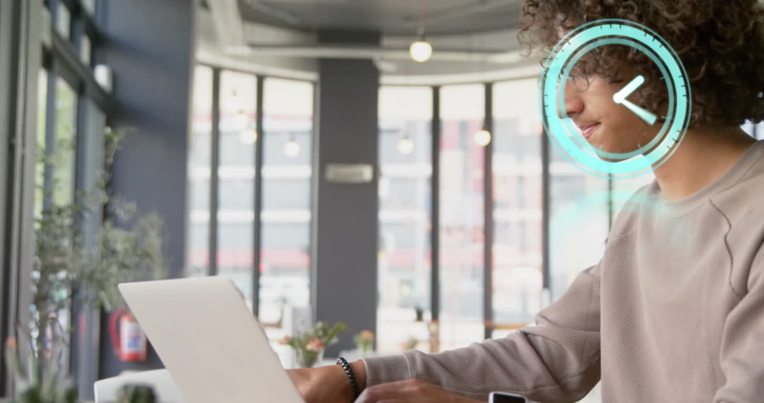 Young businessman working at a laptop with an animated clock display projected over his working face, symbolizing the integration of technology in time management and workplace efficiency. Useful for depicting concepts of digital innovation, professional productivity, and tech-centric business environments.