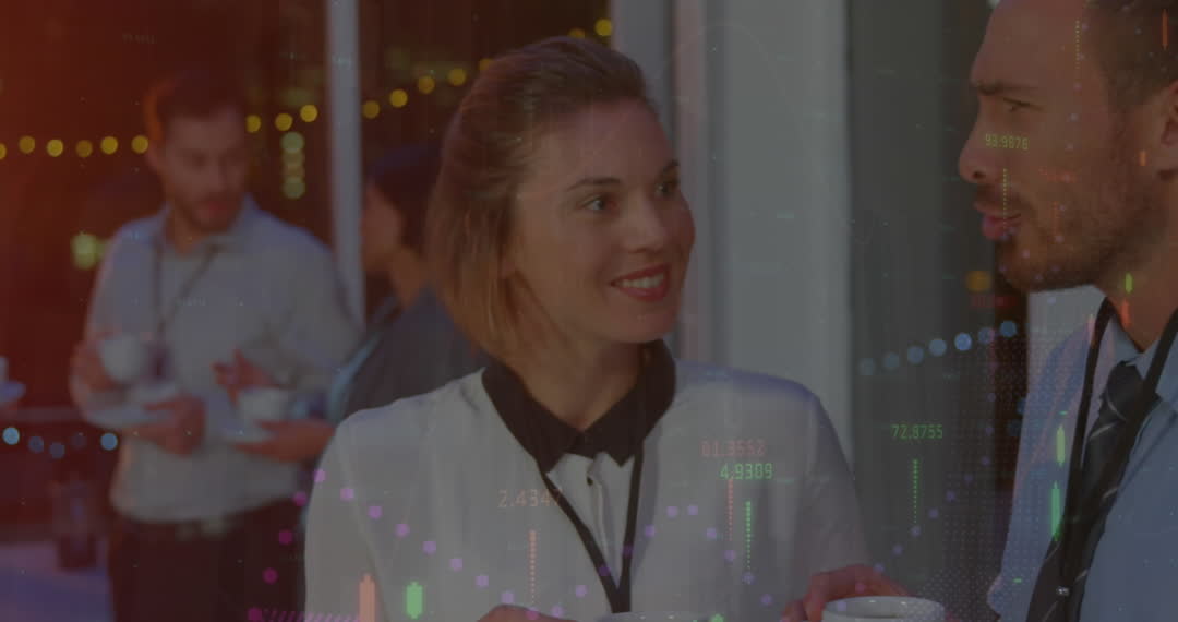 Business professionals engaging in conversation, with digital data visualizations overlaying their interactions, suggesting a technology-focused corporate environment. Ideal for depicting themes of collaboration, data-driven decision-making, or innovative business solutions.