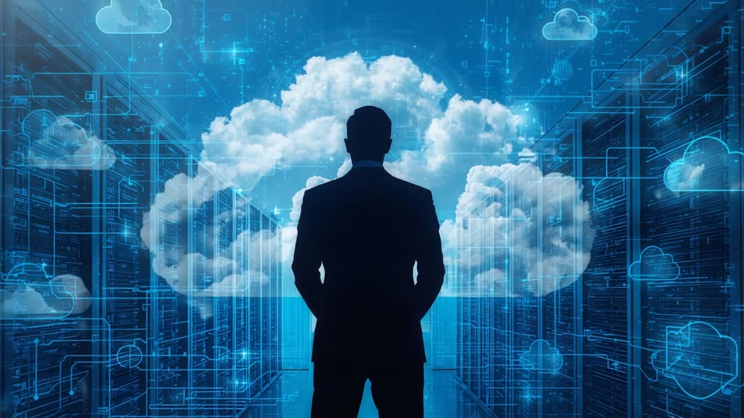 AI Generated Image. Silhouette of suited professional walking down server aisle while massive cloud hologram forming ahead and digital circuitry overlaying racks. Blue-tinted lighting and semi-transparent cloud icons pulsing across scene, creating high-tech cinematic atmosphere. Camera perspective pulling back to reveal depth between rack rows and immersive cloud visualization. Ideal for corporate tech videos, cloud service marketing, cybersecurity presentations, investor pitches, IT training modules, website hero backgrounds, and social media promos. Clip working well as opener for keynote, looping background for trade show booth, visual for whitepapers or explainer videos. Footage offering wide framing for text overlays and lower-third graphics, easy color grading for brand palette, and seamless looping potential. Visual language communicating digital transformation, cloud migration, network modernization, strategic IT leadership. Mood conveying confidence, innovation, future-focused strategy; color palette dominated by deep blues and cyan highlights.