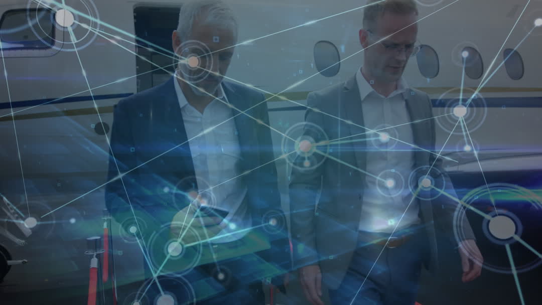 Business professionals walking near private jet as digital analytics graphics overlay provides dynamic perspective on global networking and tech innovation. Ideal for depicting modern business strategies, digital transformation and worldwide corporate finance solutions. Useful for illustrating teamwork, collaboration, and technology integration in professional settings.