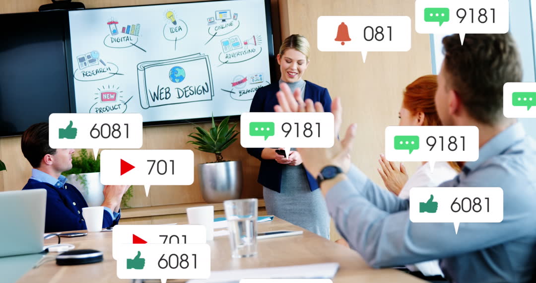 A team of business professionals hold a meeting in an office with a presentation on web design. Overlays of social media notifications and interactions add an element of digital analytics. Perfect for illustrating modern business strategies, teamwork, digital engagement, social media influence, and office collaboration speeches or workshops.