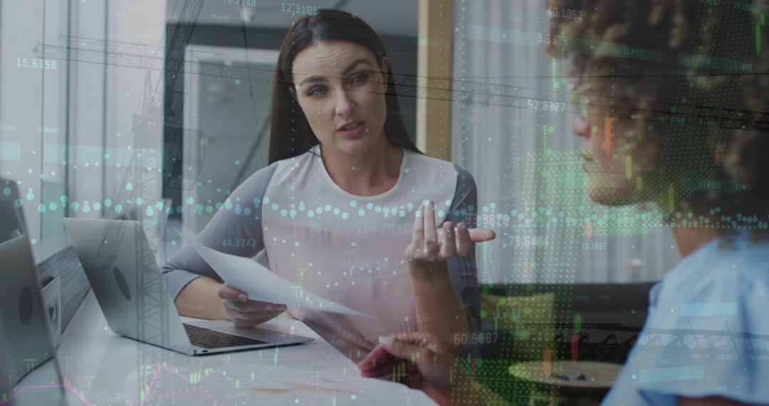 Two colleagues are engaging in a meeting with laptops and documents on the table. The overlay of financial data charts and symbols over a construction site reflects a dynamic blend of decision-making and information analysis. Fireworks in the background enhance the depiction of celebration or success in a business context. This video can be used to represent business analytics, strategic planning, innovation, impactful moments in corporate settings, or presentations.