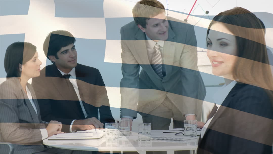 - Business Meeting Overlapping with Greek Flag as Conceptual Background