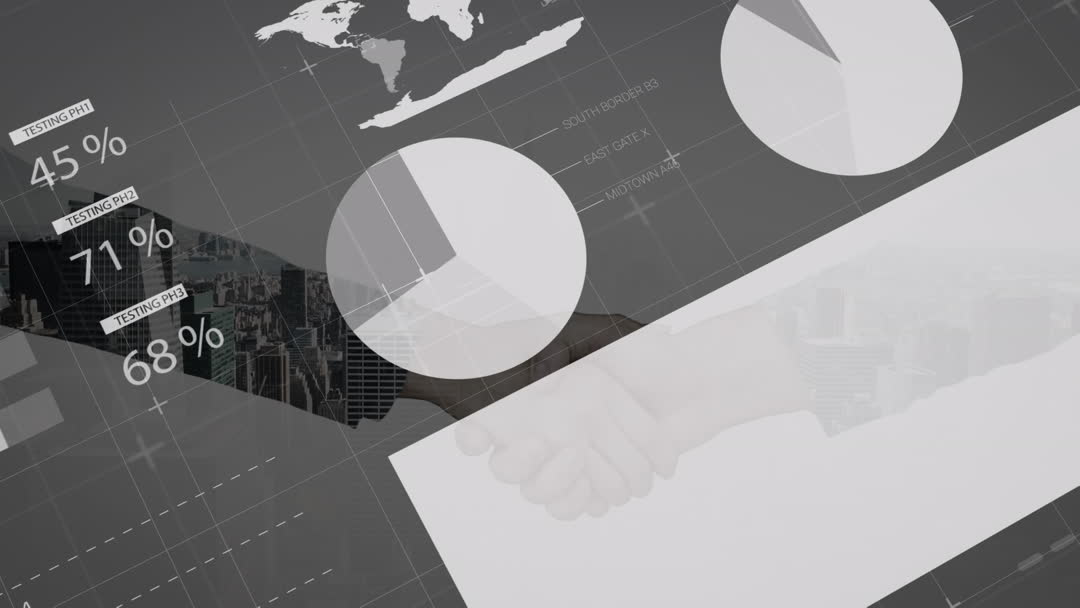 Visual representation of successful business cooperation with superimposed data graphs, illustrating global finance concepts. Ideal for use in business presentations, financial services websites, and technology marketing campaigns to convey themes of partnership and data-driven decisions.