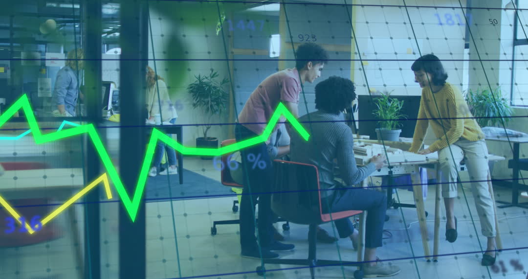 This visual represents a dynamic combination of corporate settings and digital data analytics, highlighting themes of modern teamwork and business strategy. Use this to illustrate financial forecasts, team-focused projects, or discussions on business analysis. Suitable for business and finance-oriented content, focusing on collaboration and data-driven decision making.