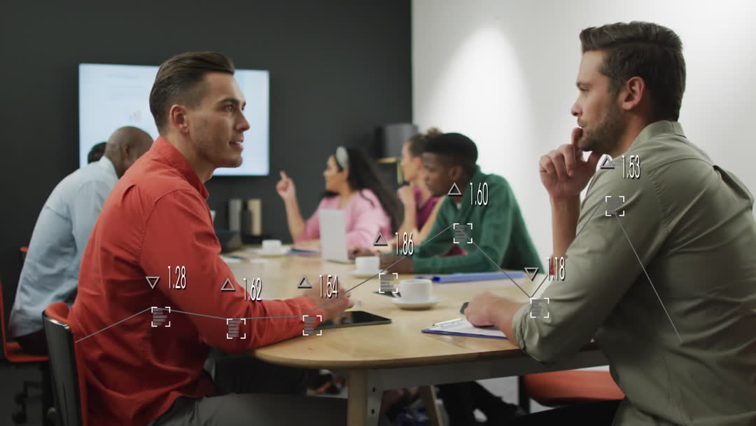 Image showing two men in a meeting with animated data processing overlay. The participants exhibit active discussion in a modern office, highlighting the integration of technology and teamwork in business analytics. Can be used for depicting collaboration, technological interactions in corporate settings, or illustrating business strategies with digital tools.