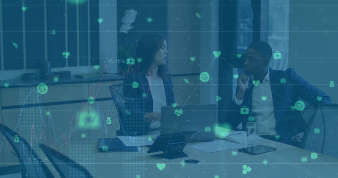 Two business professionals engaged in a discussion at a workplace while digital financial data and network connections overlay suggest technology integration. Ideal for concepts related to financial analysis, business operations advancements, collaboration technology, and digital transformation in corporate settings.