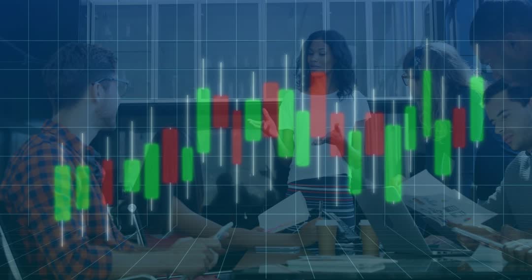 - Business Meeting with Financial Data Analysis and Candlestick Chart Overlay