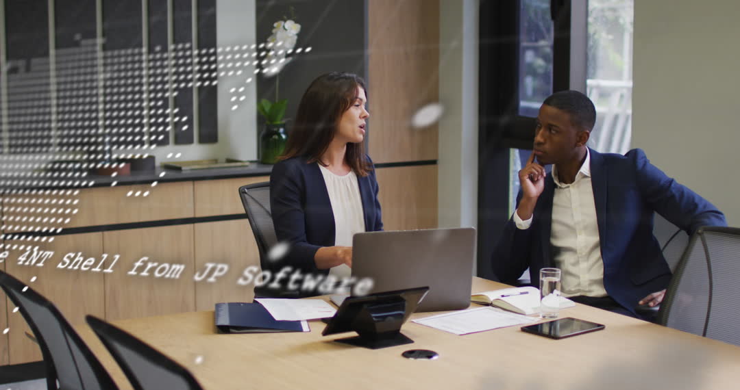 Two professionals are discussing during a business meeting in a modern office, with digital overlays of a world map and data processing graphics. This visual can be used for depicting concepts such as global business operations, technology integration, team collaboration, and data-driven decision making in professional and corporate contexts.