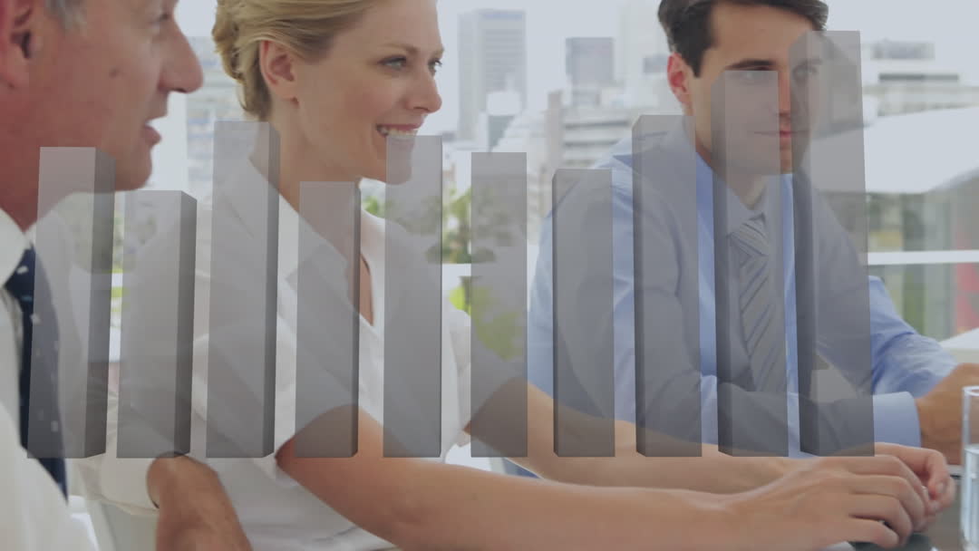 This video features business professionals engaged in discussion with a dynamic overlay of bar graphs, symbolizing financial analysis and data-driven decision making. Ideal for illustrating concepts in digital transformation in business, modern corporate settings, and technology-enhanced financial analysis and collaboration.