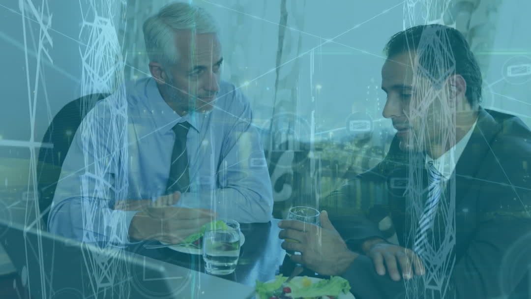 Visual showing two business executives in discussion with overlay of digital networking icons emphasizes modern corporate communication and technological advancement. Ideal for illustrating themes such as global business strategies, professional networking, corporate technology integration, and executive collaboration efforts.
