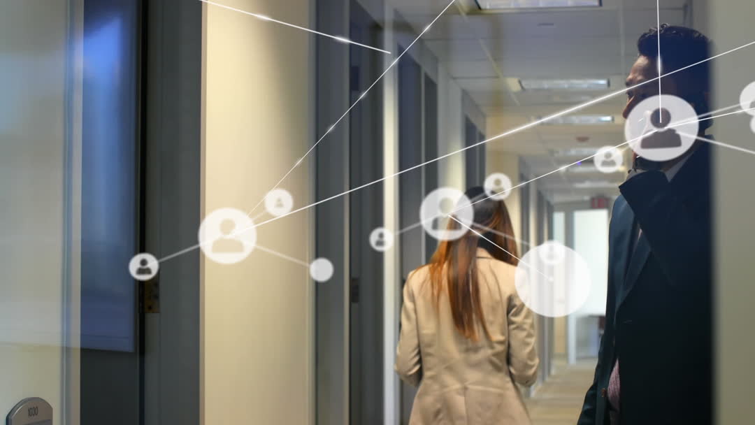 This video illustrates a dynamic business network concept, featuring an office setting where professionals are engaged in communication via technology. The animation of network icons signifies global communication and connectivity, ideal for themes related to global networking, business communications, or technology. This could be used for presentations, websites, or marketing materials focusing on professional networking and modern office environments.