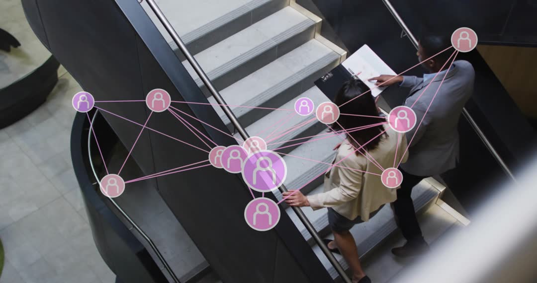 This visual captures two professionals ascending on an escalator engaging in dynamic digital interactions representing business network connections. It symbolizes modern technological connections and collaboration in a professional environment. The overlay of digital networking graphics suggests the spreading of ideas and information. Ideal for illustrating concepts of business growth, innovation technology, team collaboration, and digital networking aspects in professional contexts.