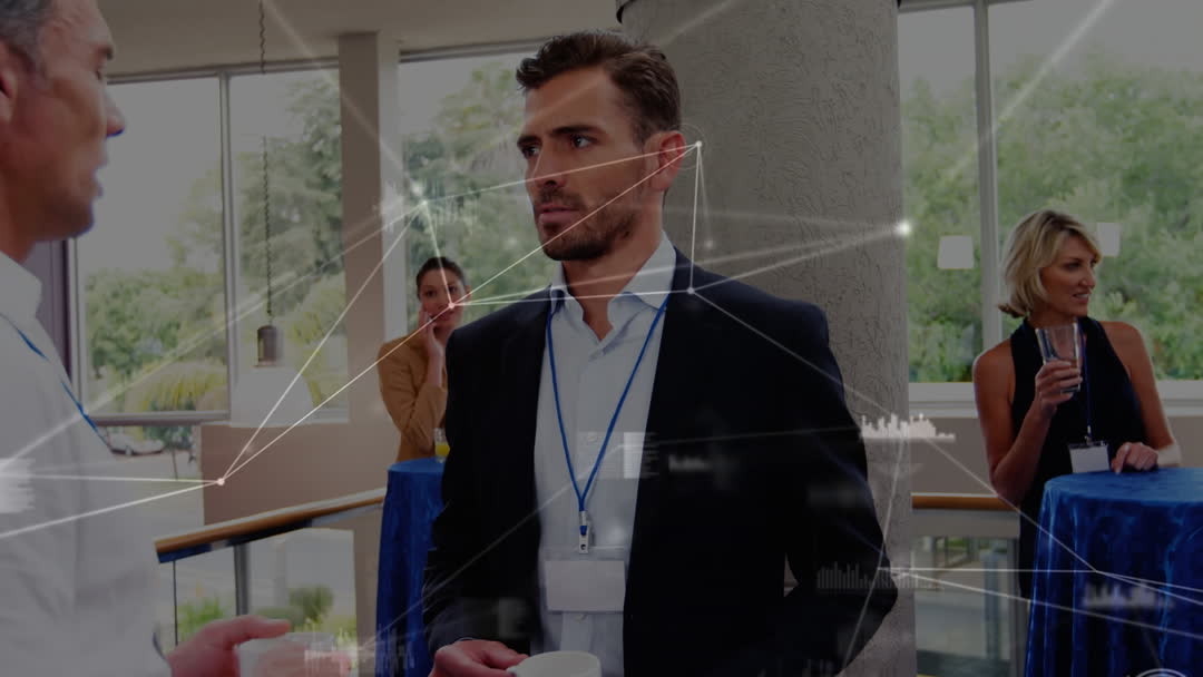 Professionals engaging in a business networking event with digital overlay of connections symbolizing technology and modern communication in a corporate setting. Ideal for content related to networking, business communication, technological advancements in business settings, teamwork, collaboration, and events.