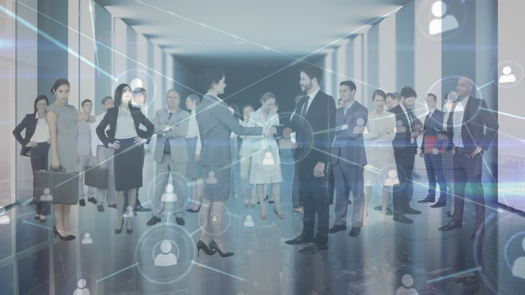 Group of business professionals engaging in networking with digital connection overlays. This is ideal for illustrating concepts of modern business communication, global networking, virtual team collaboration, or digital transformation in a corporate setting for presentations, websites, or marketing materials.