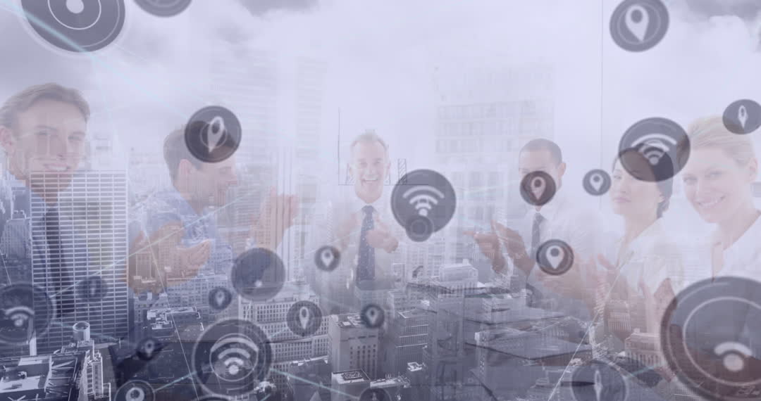 Business professionals are collaborating in an urban office space, complemented by a digital overlay exhibiting modern connectivity symbols such as WiFi icons, emphasizing technological integration in business settings. This video can be used for depicting corporate, technological innovation and air connectivity concepts in advertising, presentations or articles related to smart technology in modern business contexts.