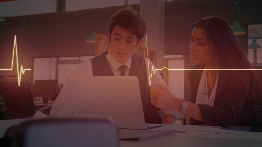 Executives are collaborating at the office, with an ECG heart monitor line showing technology integration in business. Suitable for showcasing business strategies, health tech collaborations, or modern office environments. Ideal for presentations and marketing related to tech-enhanced solutions or corporate teamwork.