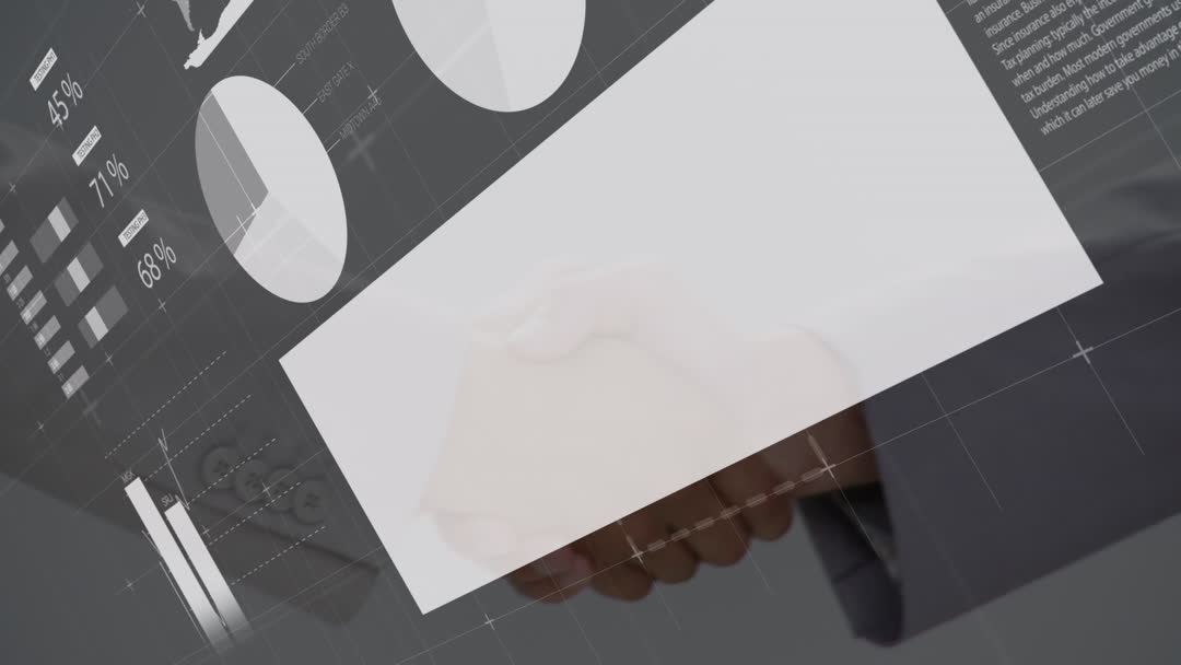 Dynamic visual depicting collaboration in business through a handshake with data and graphs overlay, representing the blend of human interaction and technological analytics. Ideal for use in features on global finance, technology collaborations, and modern business strategies.