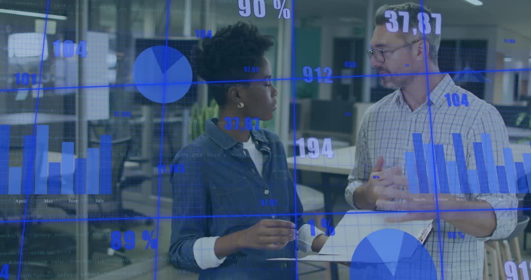 Two professionals engaging in discussion about data insights, with digital graphs and statistics overlaying the scene. Ideal for illustrating teamwork in data-driven environments, modern business strategies, or digital transformation in a corporate setting.