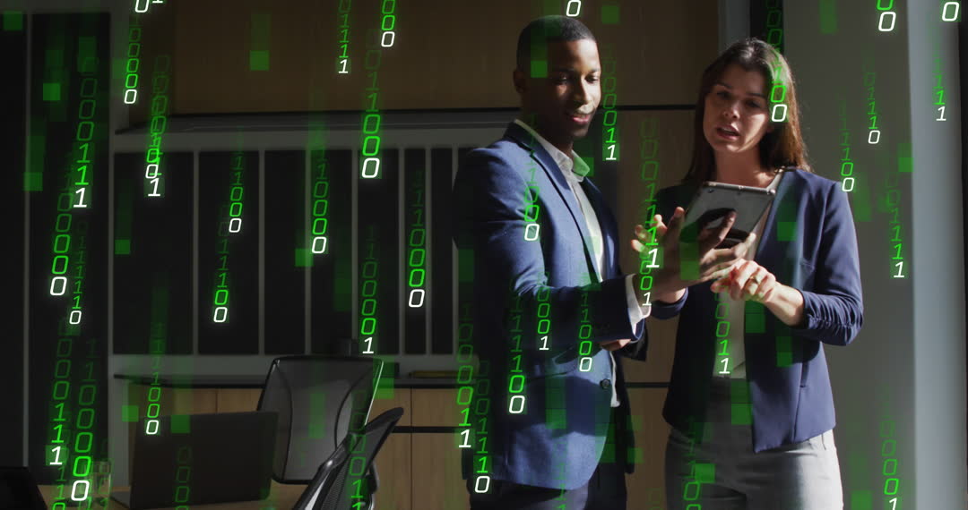 Business People Engaging with Binary Code Overlay Video