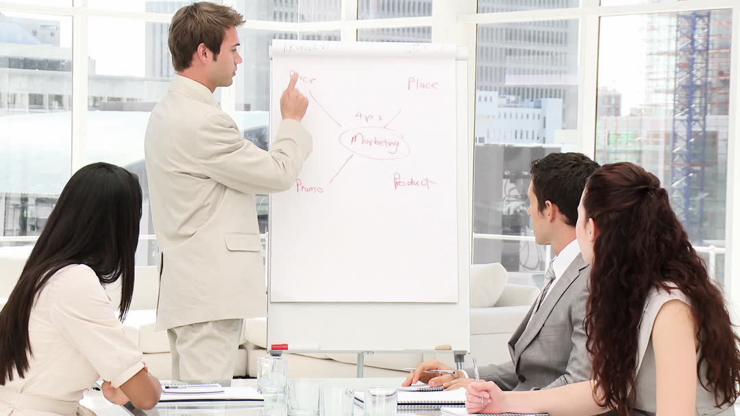 Business professional presenting in light-filled office room, engaging team with marketing strategy using whiteboard. Suitable for content on corporate meetings, business strategies, teamwork clips, or guides on effective office presentations.