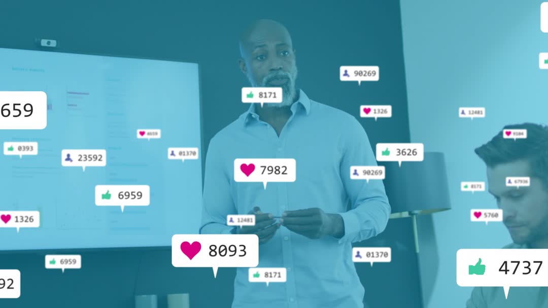 Engaging business pitch reveals social media strategies as metrics like likes and shares appear. Ideal for illustrating concepts of digital marketing, analytics, and teamwork strategies to boost audience engagement in tech-savvy environments.