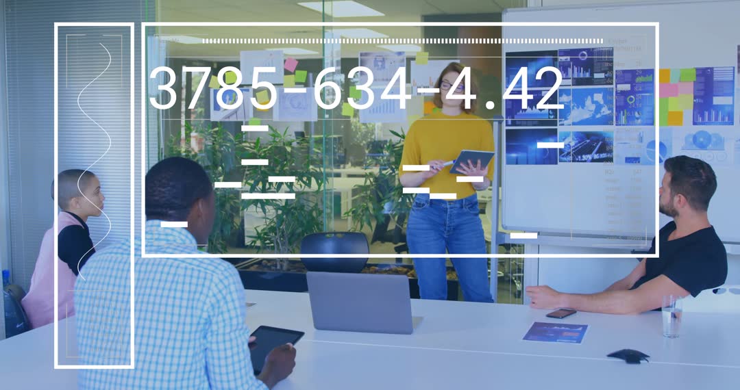 This scene captures a professional business environment where a presenter uses charts and a digital device to illustrate return on investment (ROI) during a team meeting. Animated numbers enhance engagement and illustrate financial data, showcasing innovation in data analysis and team communication. Ideal for articles or websites focused on business strategies, digital tools in corporate environments, or tutorials on effective team collaborations and presentations.