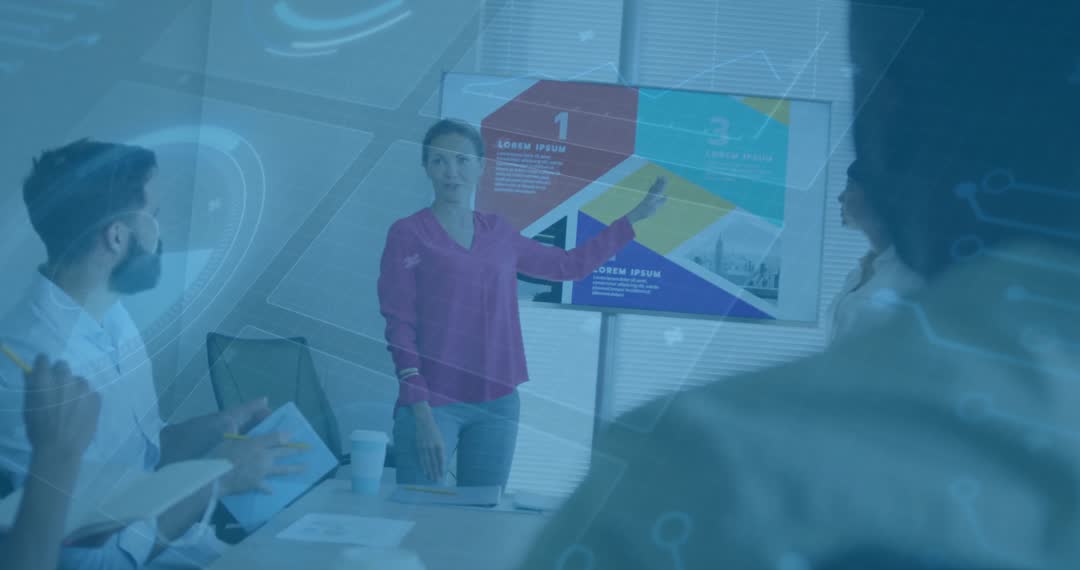 Female presenter foreground leading discussion with animated graphics demonstrating modern technological aspects. Ideal for showcasing corporate environment, modern business meetings, work culture, inventive solutions. Further suited for materials highlighting collaboration and effective communication using digital tools. Use in advertisements or posters emphasizing innovation or strategic planning.