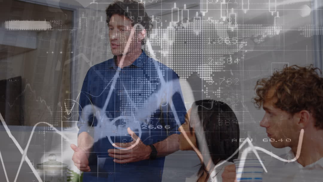 Image depicts multicultural colleagues engaging in a business presentation at an office, with a digital overlay of financial graphs and statistics representing ongoing analysis or strategic discussion. This visual can be used in contexts pertaining to corporate environments, teamwork, financial planning, data visualization, and technological advances in business operations. Suitable for articles about business strategies, teamwork efficacy, or finance technology integration.