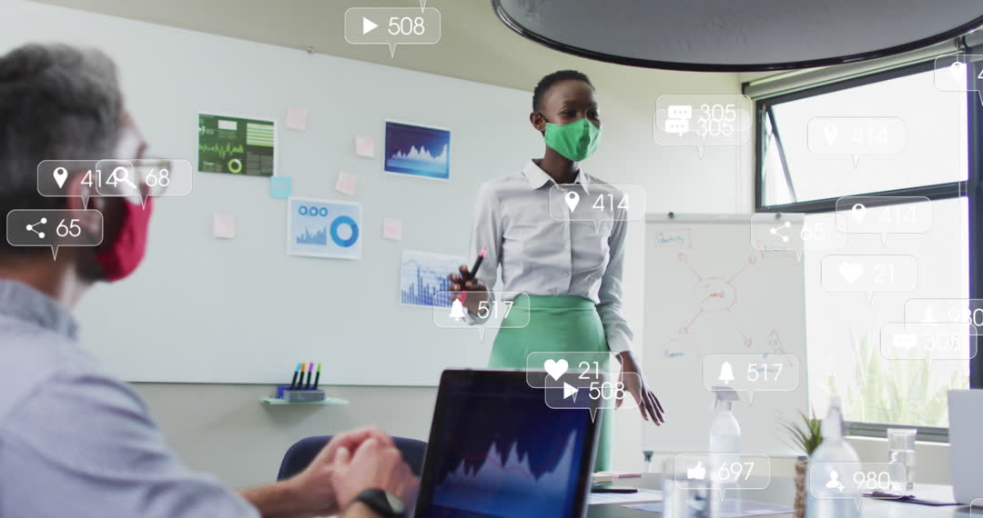 African American woman wearing face mask giving dynamic presentation in modern office. Social media interaction icons floating around create engaging blend of physical and digital presence. Suitable for illustrating hybrid work setups, digital marketing strategies, business presentations, social media marketing, or pandemic impacts on professional environments.