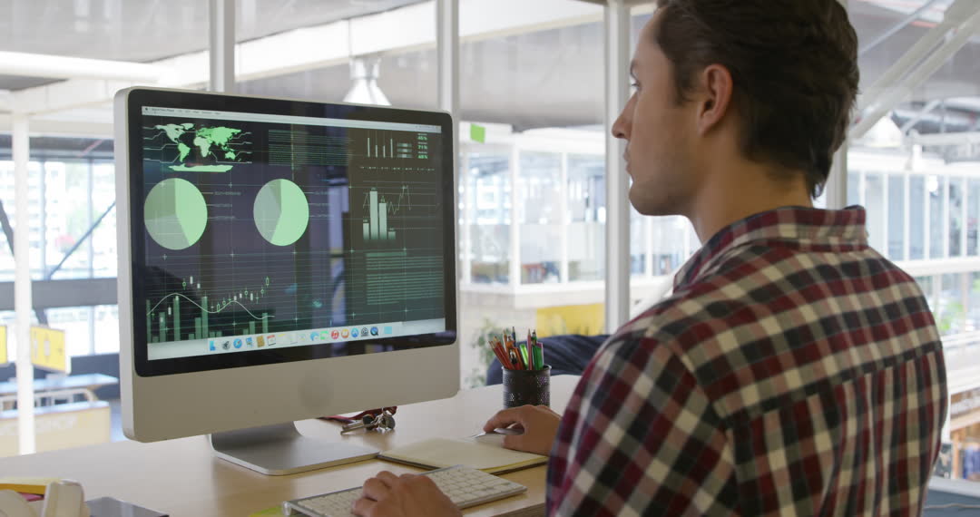 A young Caucasian male business professional is sitting in a contemporary office environment, focused on data analysis displayed on a computer monitor. The workspace is modern and bright, contributing to a professional and innovative atmosphere. This can be used to highlight themes of business analytics, technology in the workplace, and modern office settings, suitable for office decor, corporate presentations, or workplace diversity campaigns.