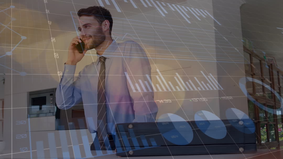 Caucasian businessman is at office on phone, multitasking with clear overlay of graphs and charts, indicating use in presentations related to modern business analysis, technology integration, and executive communications.