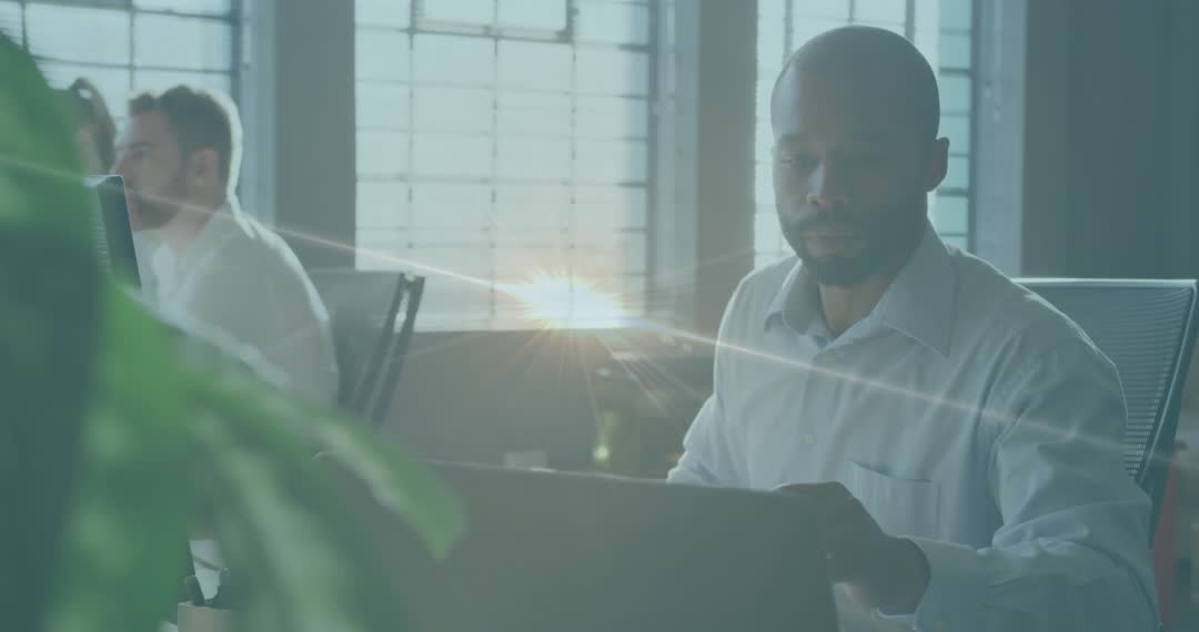 Male employee working on laptop amidst a bustling modern office environment, engaged with animated business charts. Light filters through large windows, creating an ideal work ambiance. Image captures essence of productivity and technological integration in professional settings. Suitable for depicting corporate environments, concept of data analysis, technology use in workplaces, business presentations or promotional materials for tech solutions.
