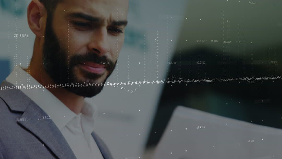 Man in professional attire analyzing complex digital patterns and statistics overlay. Perfect for illustrating themes related to business intelligence, technology integration, data science, financial forecasts, or digital transformation strategies in presentations and marketing materials.