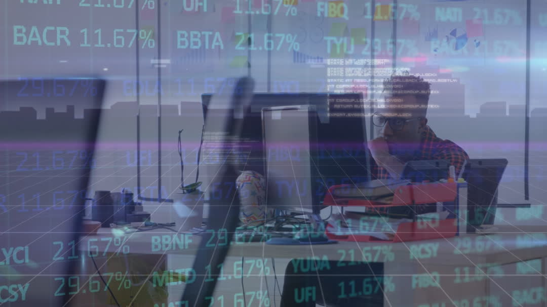 Picture depicts man deeply engaged in financial data analysis on multiple computer screens, reinforcing tech-savvy environment in modern office space. Young professional represents focused work setting with overlay of financial statistics, symbolizing data-driven decision-making. Useful for illustrating themes related to finance, analytical workspaces, and corporate professional life, or showcasing products related to financial software, modern business practices, or office solutions.